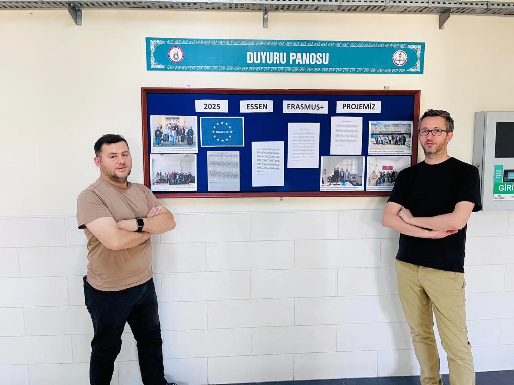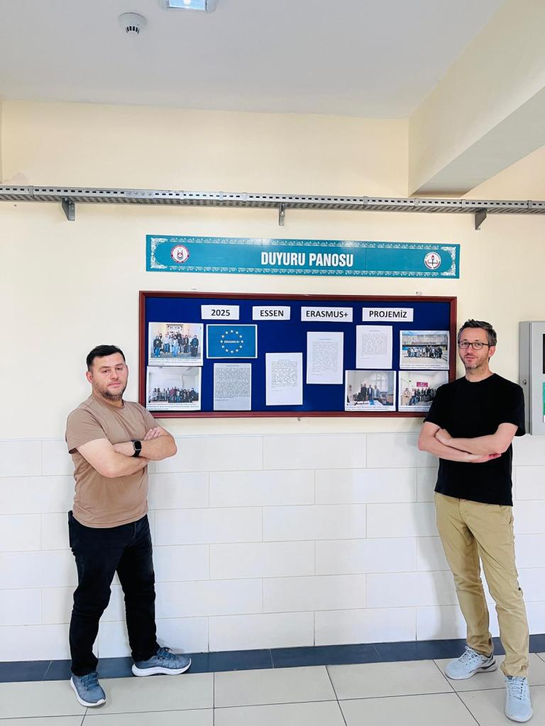 Yukarıdaki fotoğrafta da görüldüğü üzere, okul giriş kattaki koridorda yer alan projenin önemli anları ve detayları sergileniyor. 2025 yılında gerçekleşen “ESSEN ERASMUS+ PROJEMİZ” temalı panoda, öğrencilerin ve öğretmenlerin Almanya’daki eğitim faaliyetleri, kültürel gezileri ve edindikleri tecrübeleri yansıtan görseller ile bilgilendirici metinler yer alıyor.